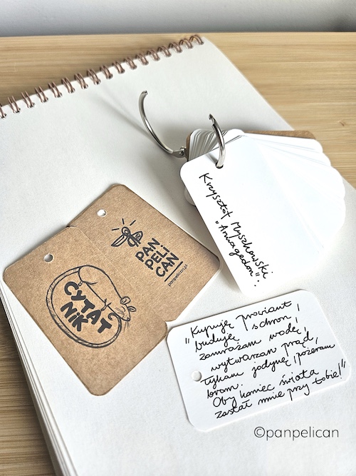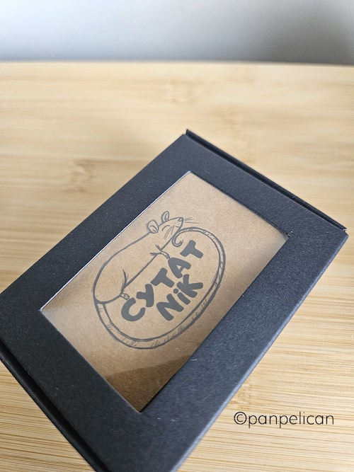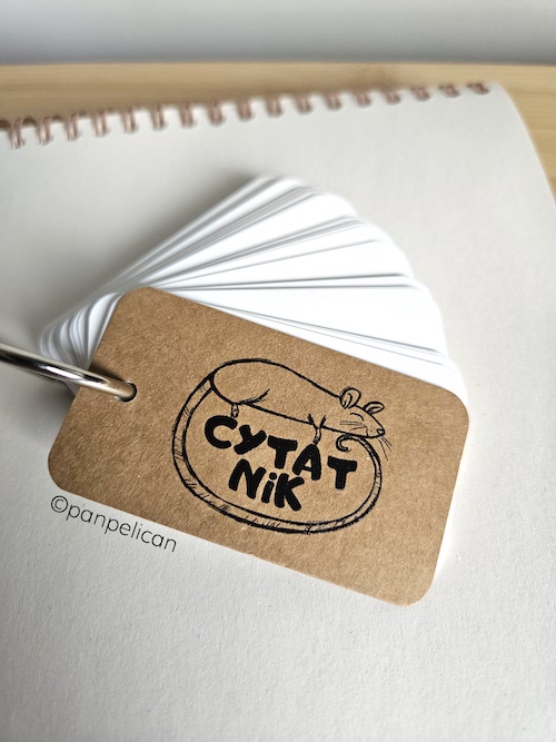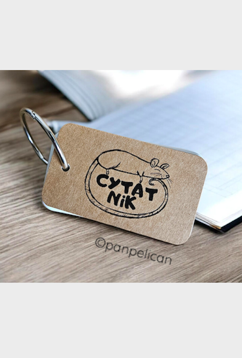 „Cytatnik Myszka”. Cytatniki to mój pomysł na to, aby zachować najbardziej wzruszające lub najśmieszniejsze albo po prostu mądre cytaty z ulubionych książek, wierszy, piosenek czy filmów i mieć je zawsze przy sobie. Każdy notesik, zaopatrzony w rozpinane, jak w segregatorze kółko, ma sto karteczek, które czekają na Twoje wpisy. Pakowane w prezentowe, czarne pudełeczka. Na okładkach autorskie grafiki z serii „Zwierz czyta też!”. Rozmiary: 7 cm x 4 cm.