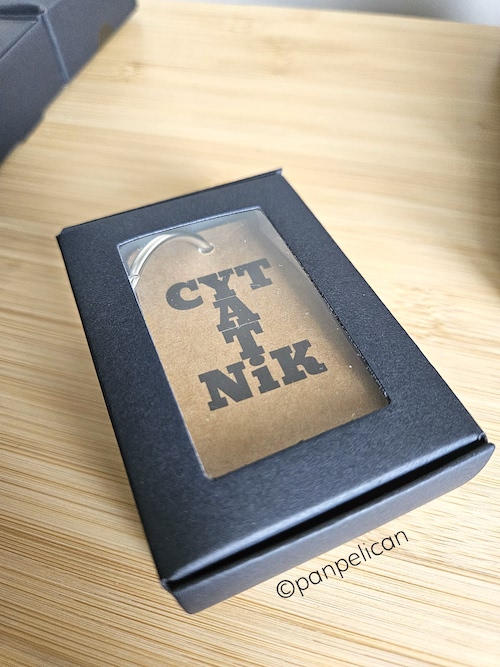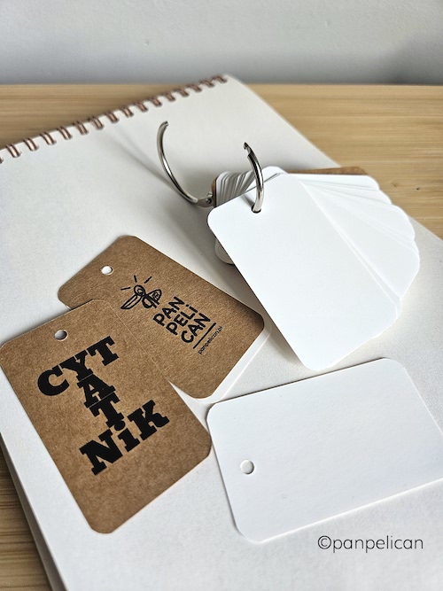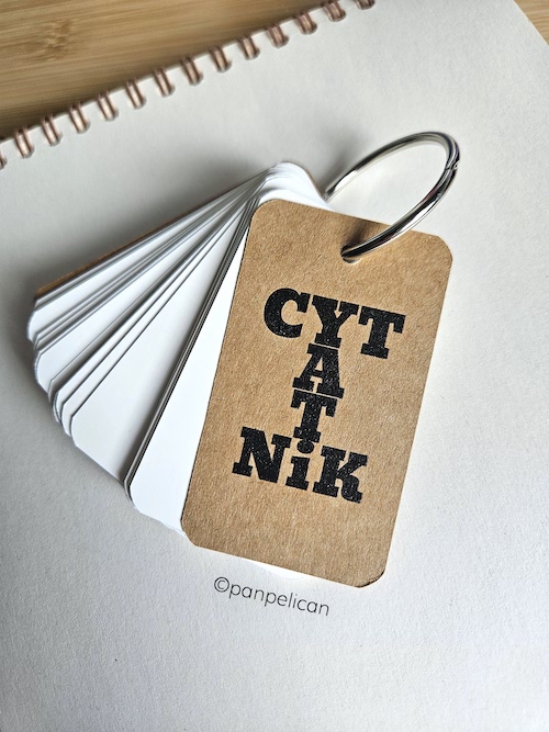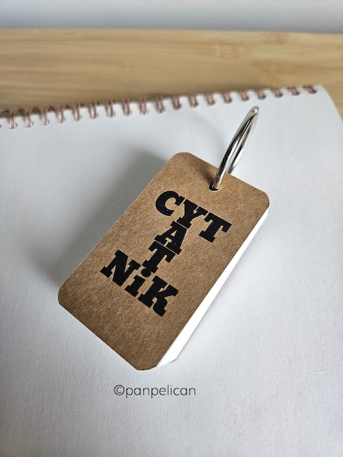 Cytatniki to mój pomysł na to, aby zachować najbardziej wzruszające lub najśmieszniejsze albo po prostu mądre cytaty z ulubionych książek, wierszy, piosenek czy filmów i mieć je zawsze przy sobie. Każdy notesik, zaopatrzony w rozpinane, jak w segregatorze kółko, ma sto karteczek, które czekają na Twoje wpisy. Opakowane w prezentowe, stylowe czarne pudełeczka. Rozmiary: 7 cm x 4 cm.