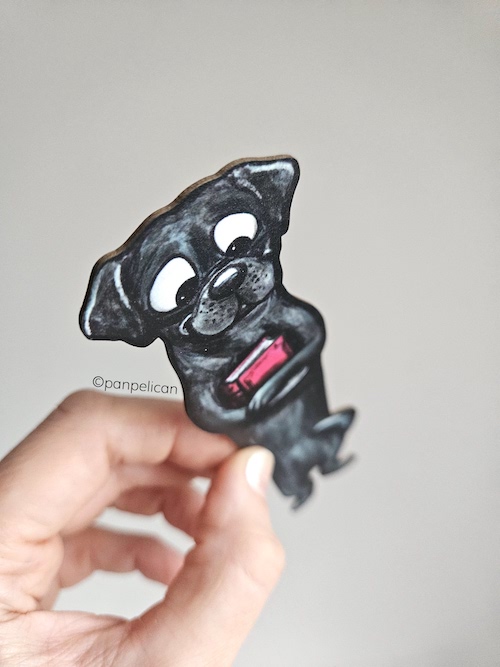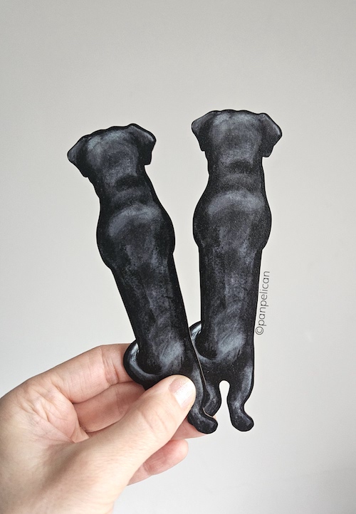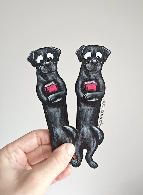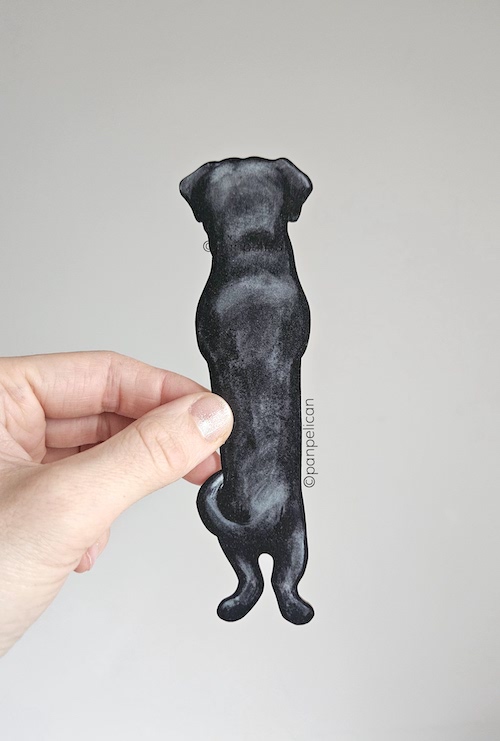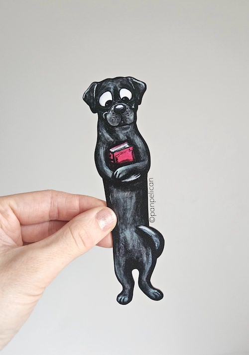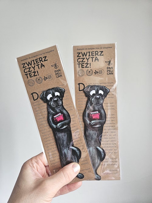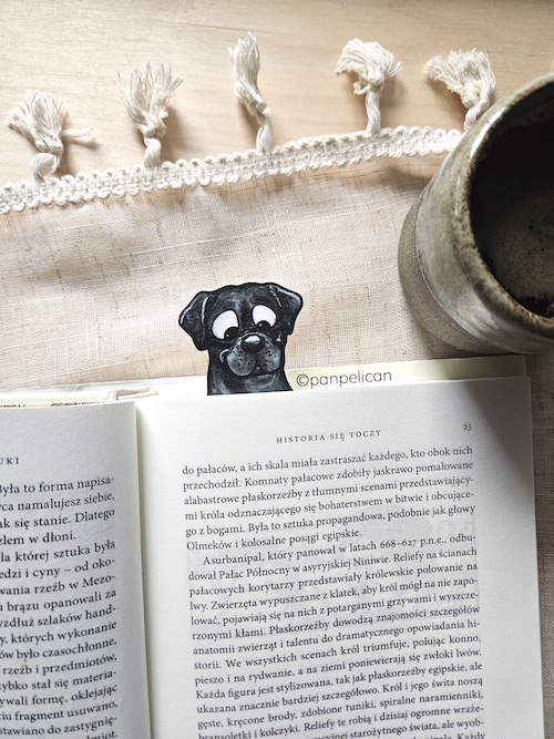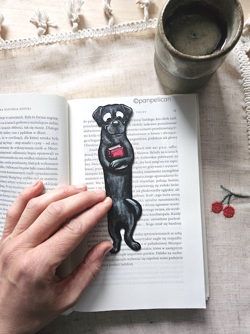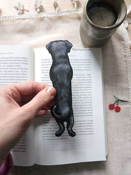 Autorska dwustronna zakładka do książki „Czarny labrador Blackie”*. Druk na ekotekturze, reprodukcja malowanego ręcznie wzoru. Wymiary: 17 cm x 1mm.