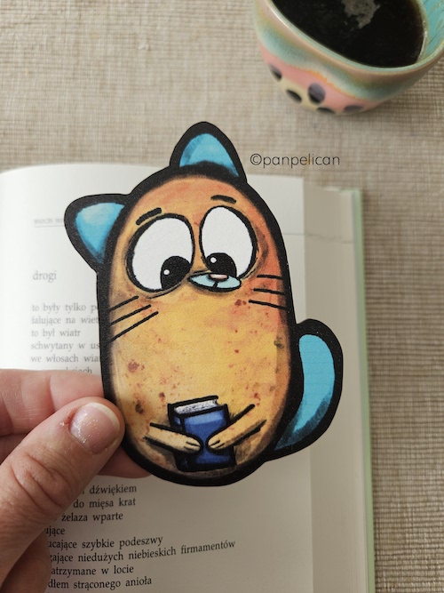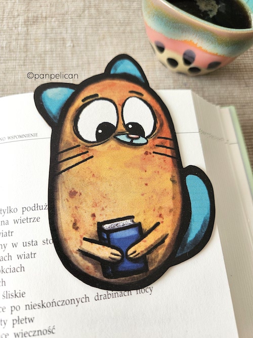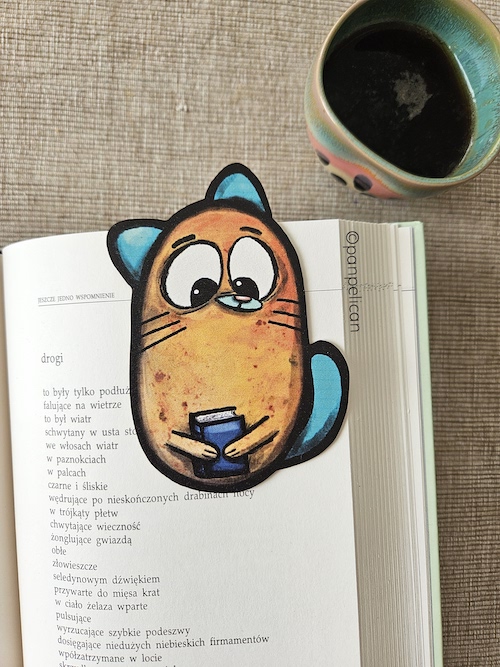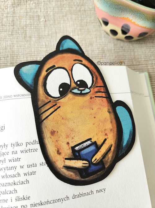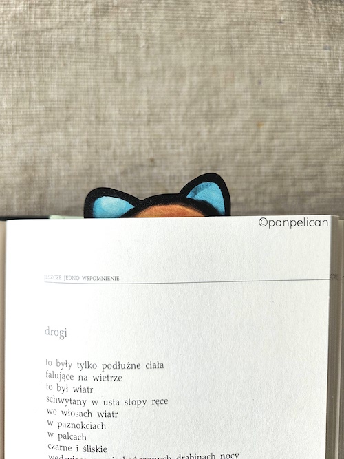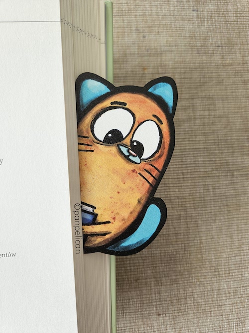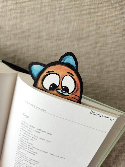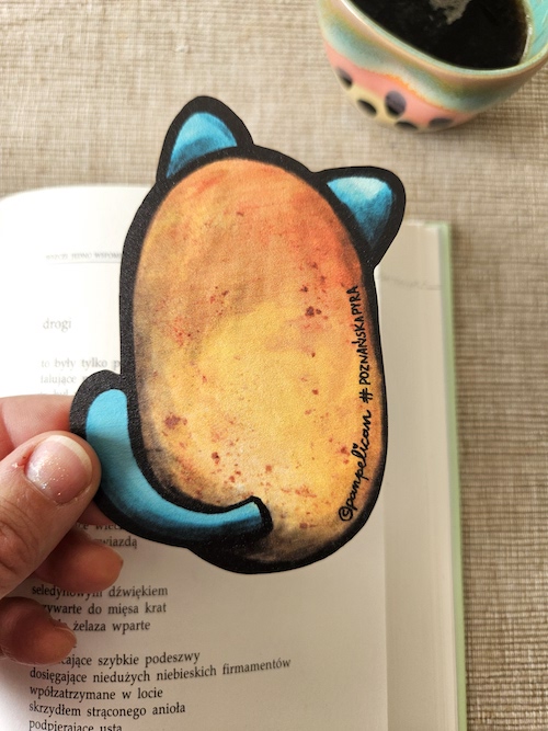 Autorska dwustronna zakładka do książki „Gum Pyra”; druk UV na ekotekturze; reprodukcja malowanego ręcznie wzoru, wymiary: 11 cm x 1mm.