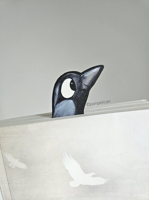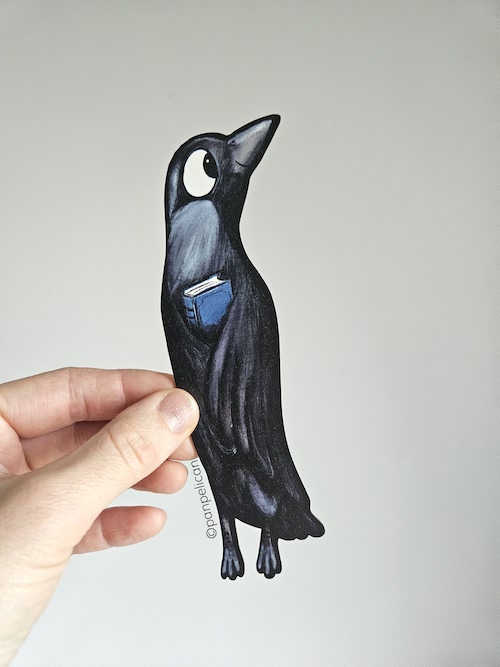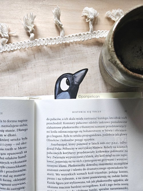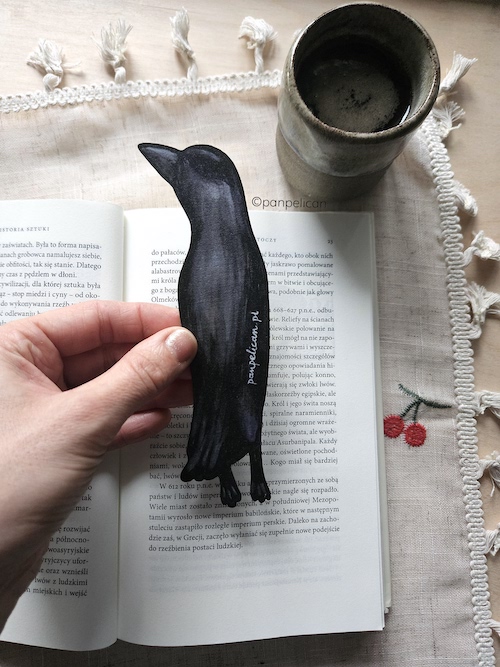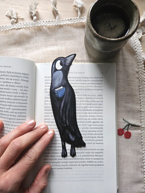Autorska dwustronna zakładka do książki „Kawka”. Druk na ekotekturze, reprodukcja malowanego ręcznie wzoru. Wymiary: 16 cm x 1mm.