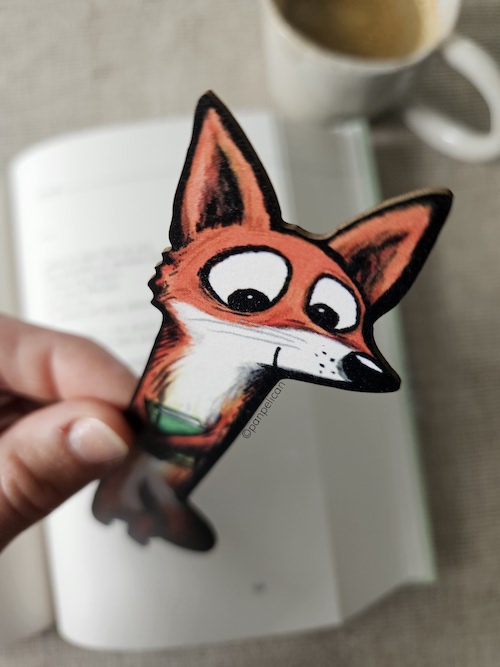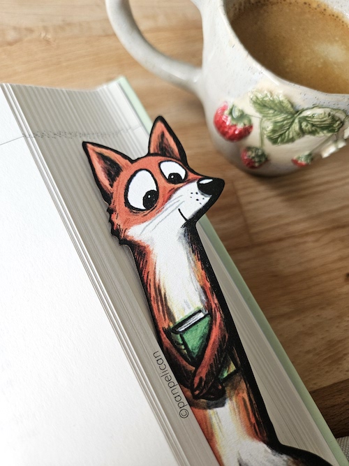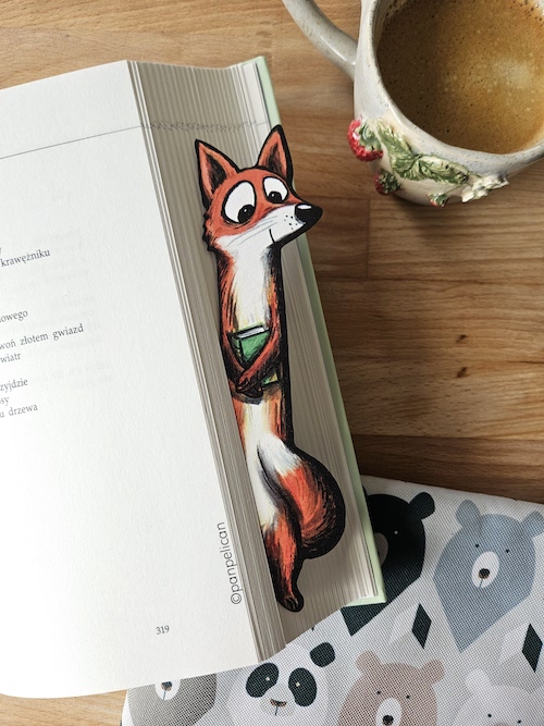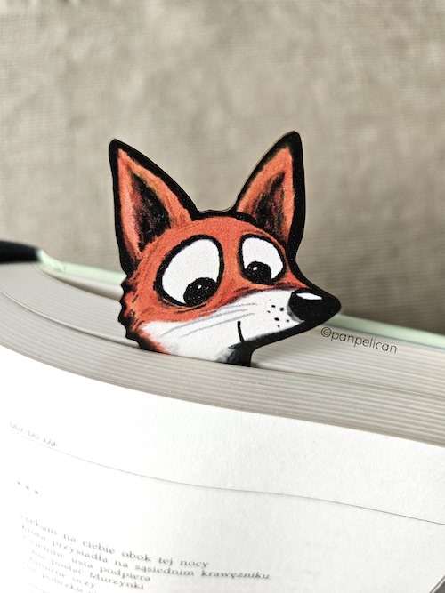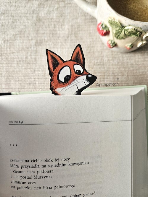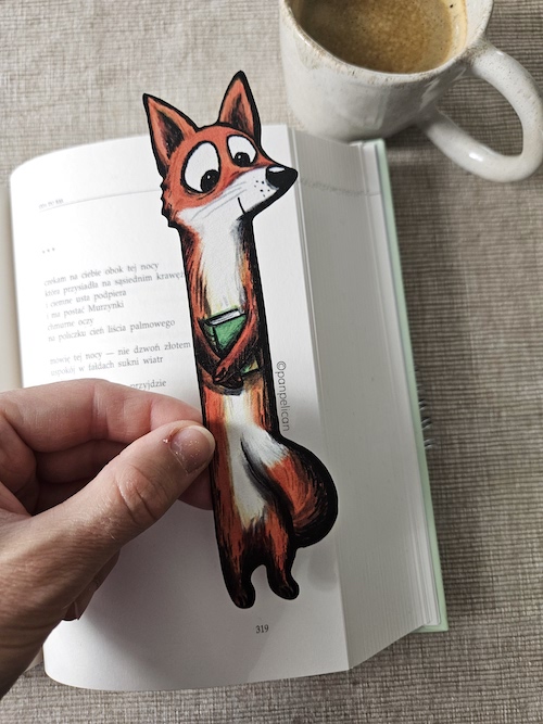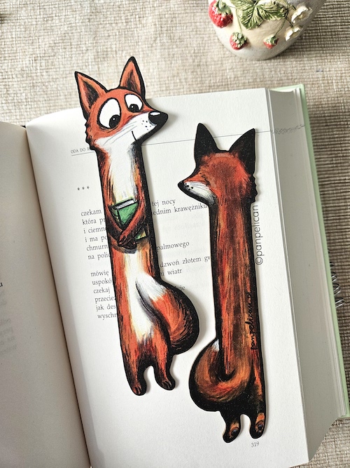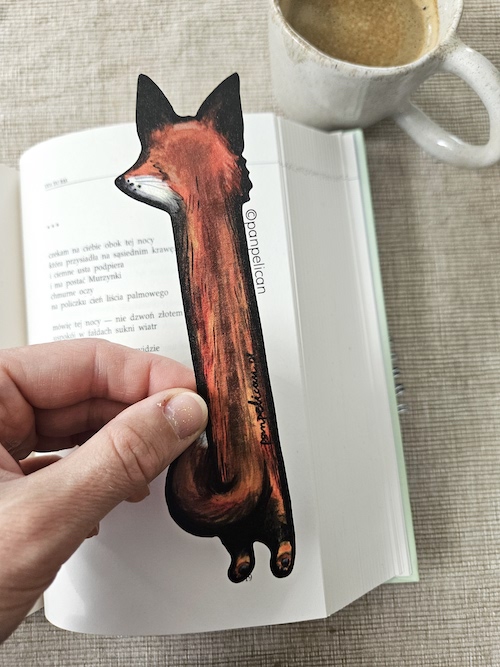 Autorska dwustronna zakładka do książki „Lisek”. Druk na ekotekturze, reprodukcja malowanego ręcznie wzoru. Wymiary: 17 cm x 1mm.