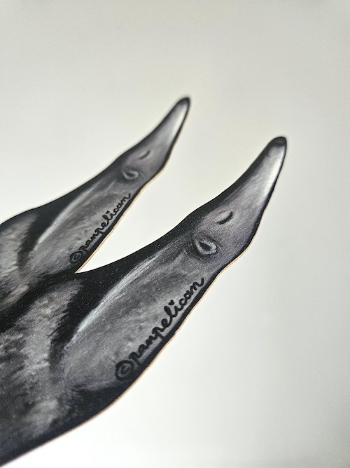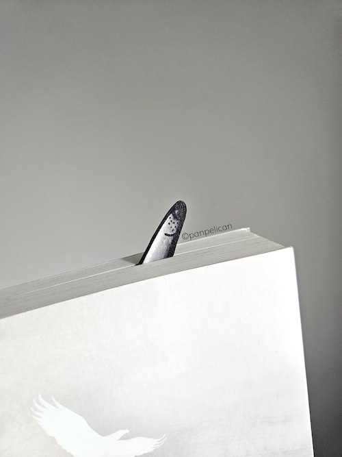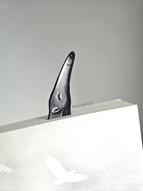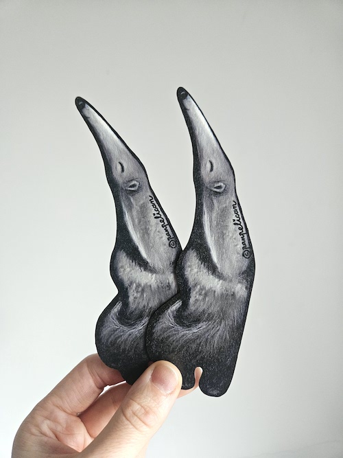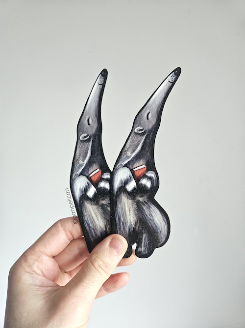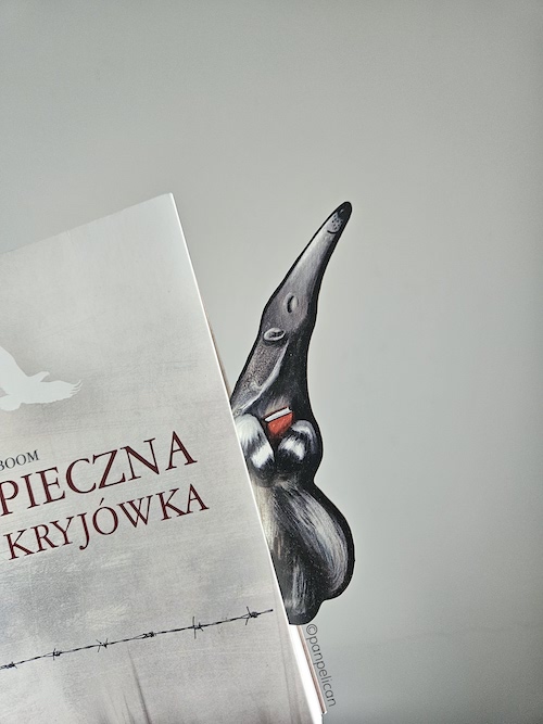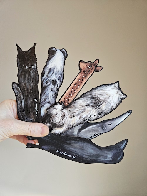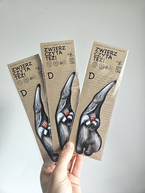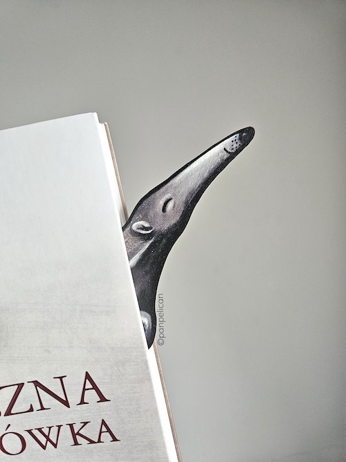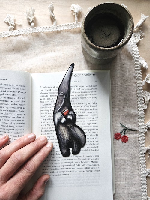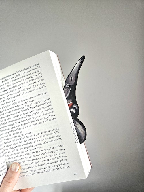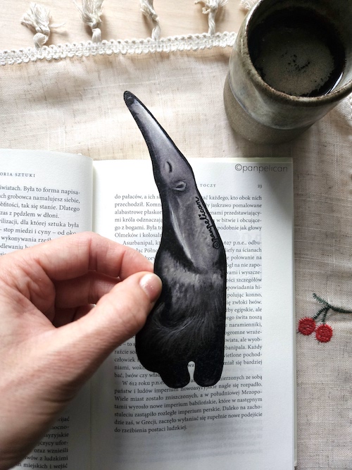 Autorska dwustronna zakładka do książki „Mrówkojad”. Druk na ekotekturze, reprodukcja malowanego ręcznie wzoru. Wymiary: 16 cm x 1mm.