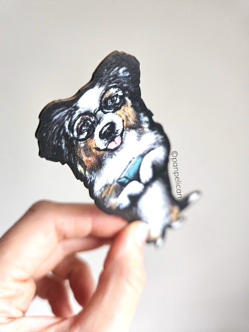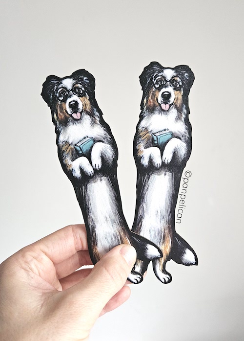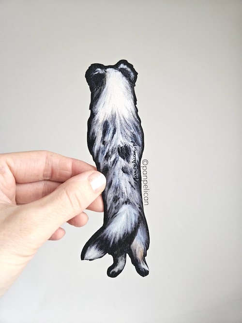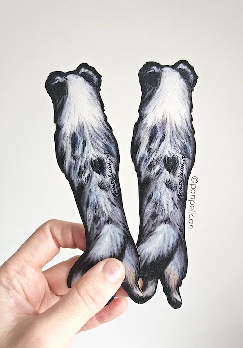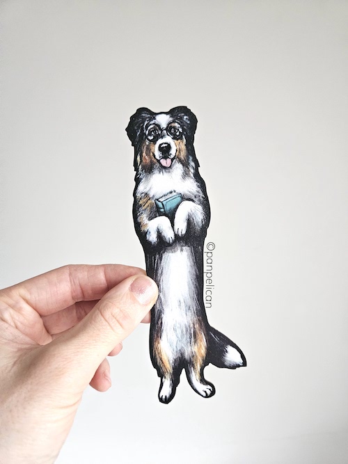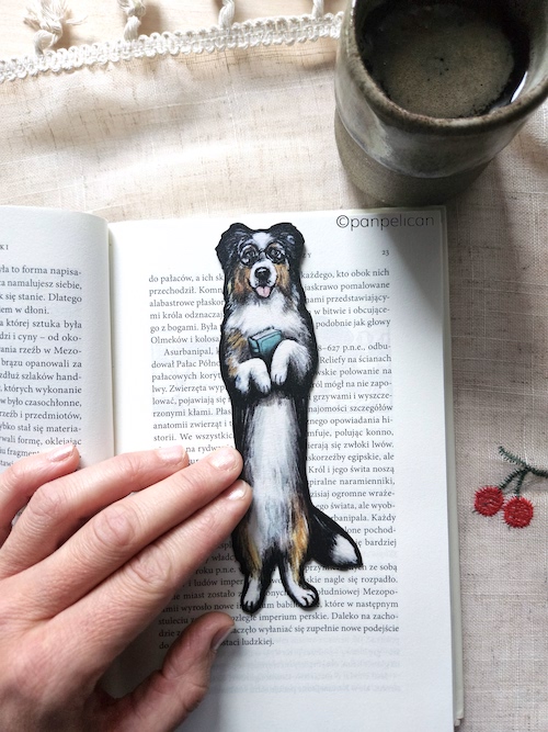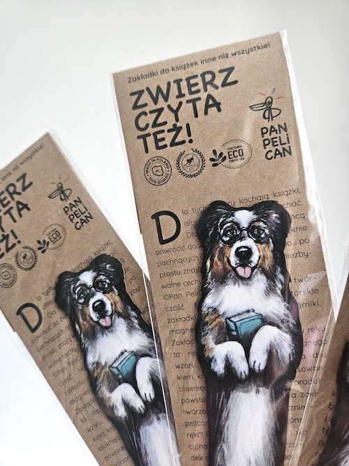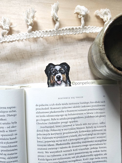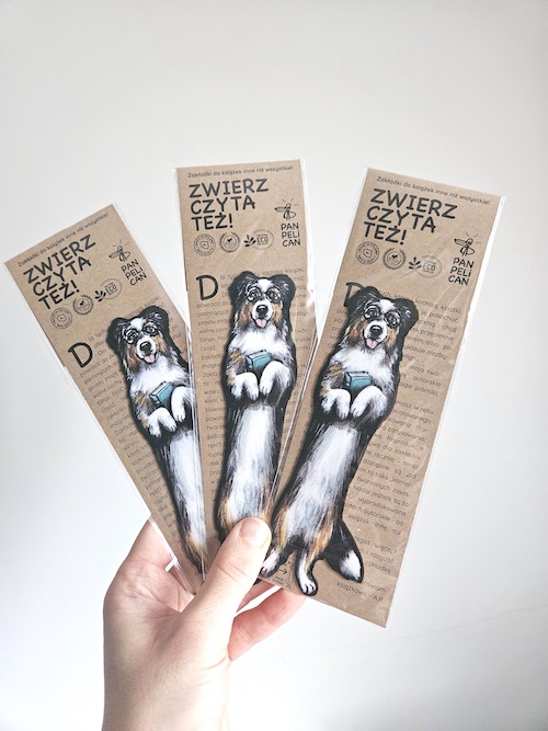 Autorska dwustronna zakładka do książki „Owczarek australijski Baloo” (w typie pinczera holenderskiego)*. Druk na ekotekturze, reprodukcja malowanego ręcznie wzoru. Wymiary: 17 cm x 1mm.