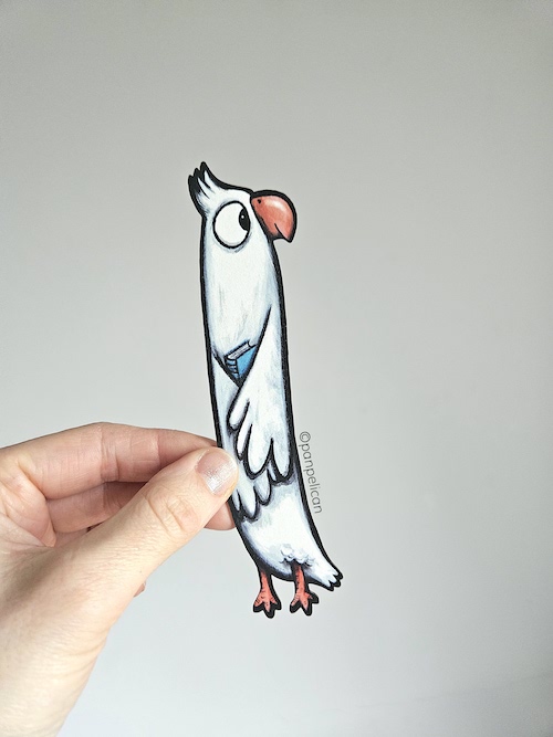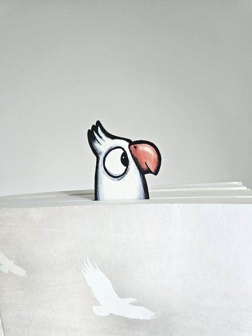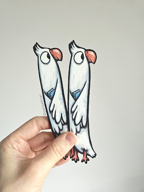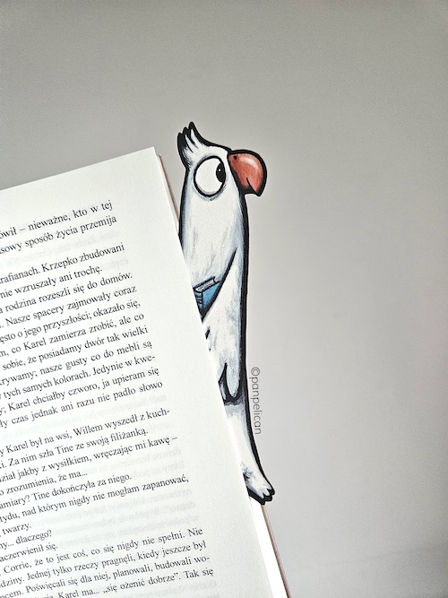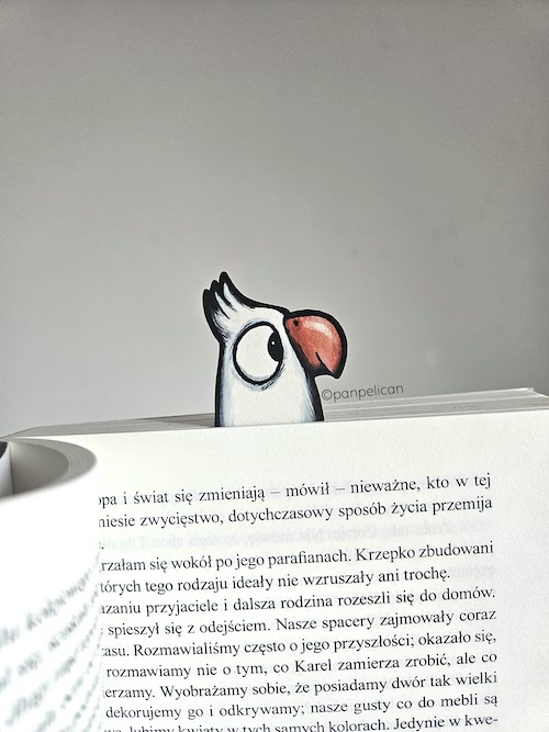 Autorska dwustronna zakładka do książki „Papuga”. Druk na ekotekturze, reprodukcja malowanego ręcznie wzoru. Wymiary: 16 cm x 1mm.