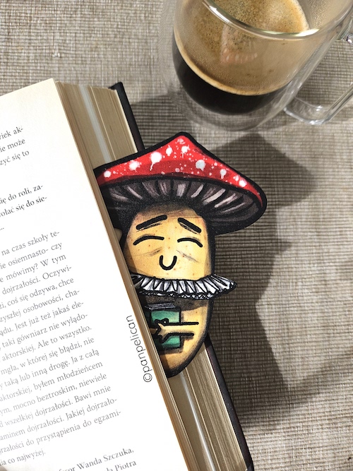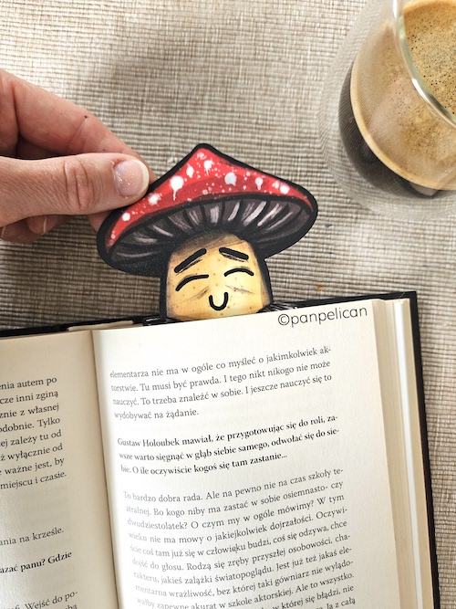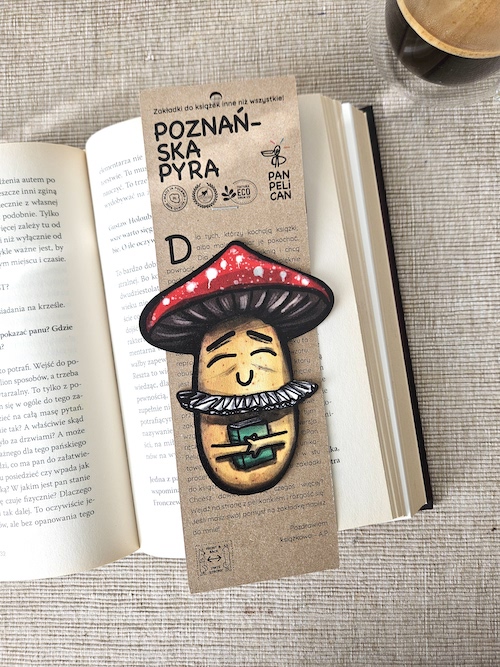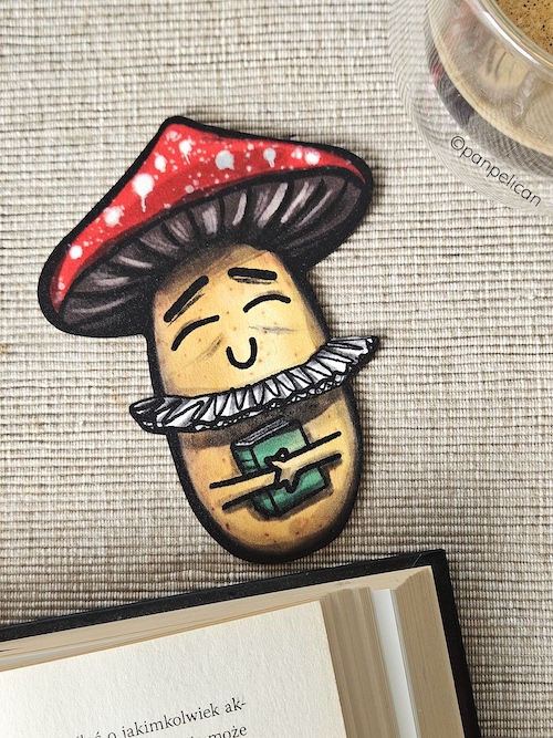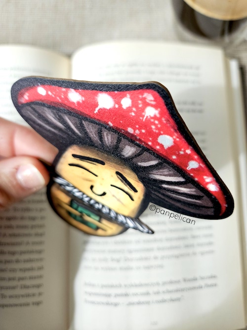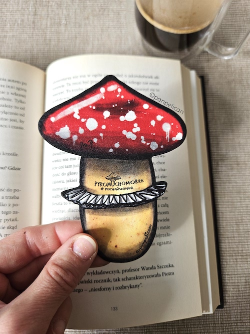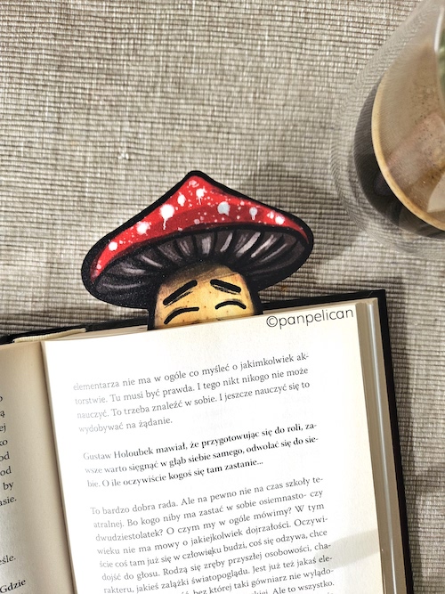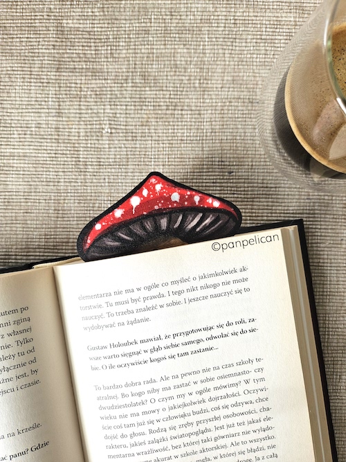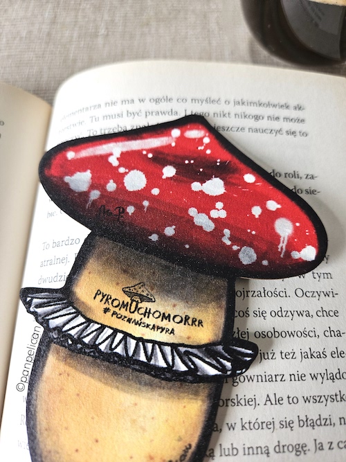 Autorska dwustronna zakładka do książki „Pyra Muchomor”. Druk na ekotekturze, reprodukcja malowanego ręcznie wzoru. Wymiary: 11 cm x 1mm.