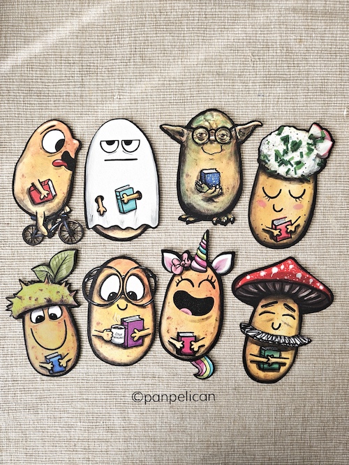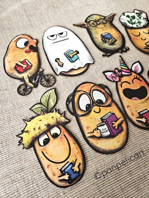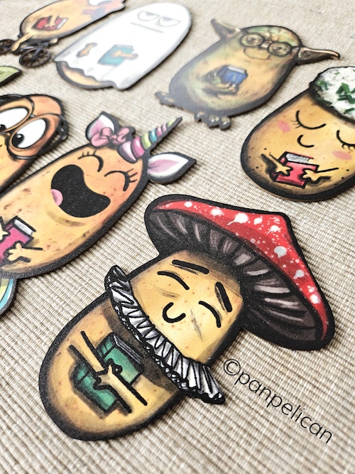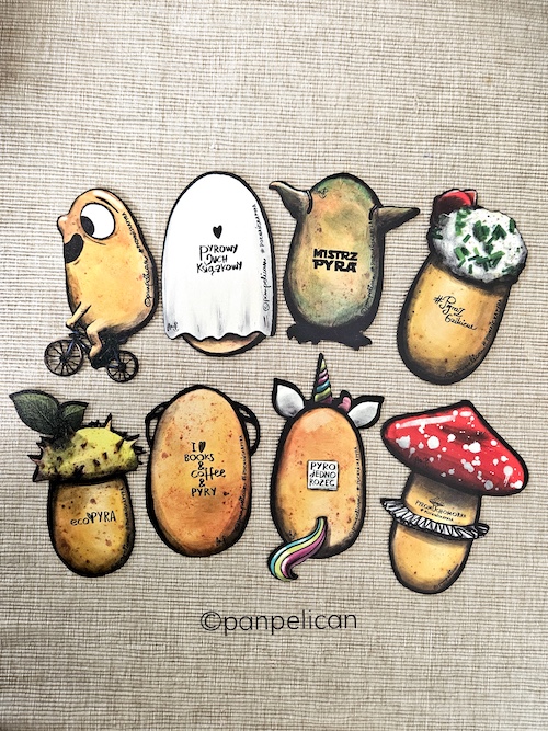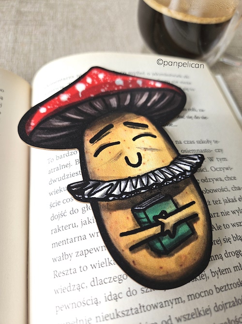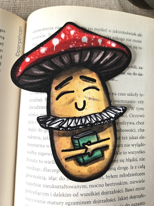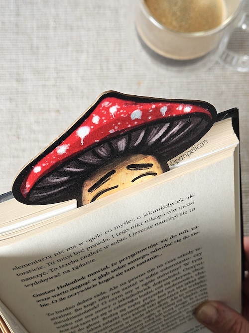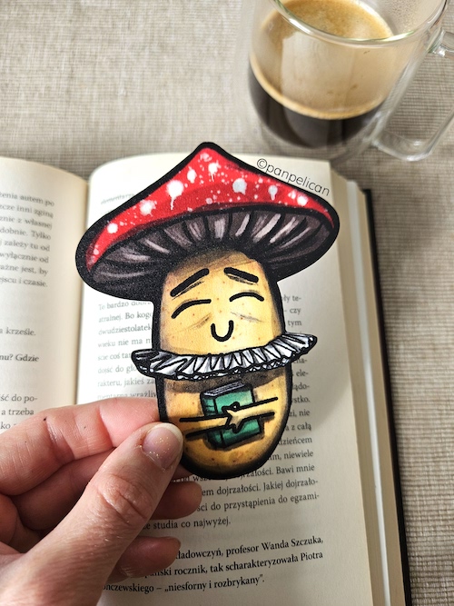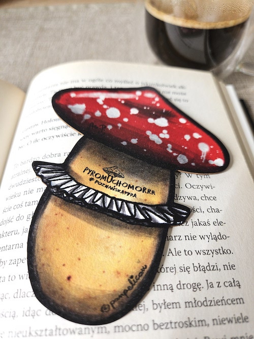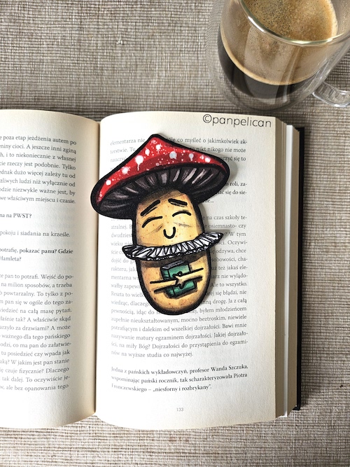 Autorska dwustronna zakładka do książki „Pyra Muchomor”. Druk na ekotekturze, reprodukcja malowanego ręcznie wzoru. Wymiary: 11 cm x 1mm.