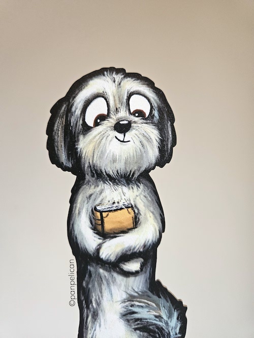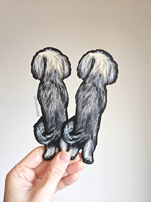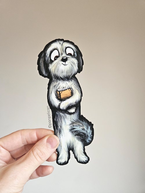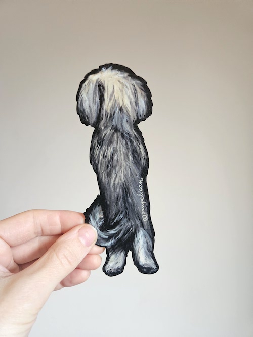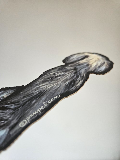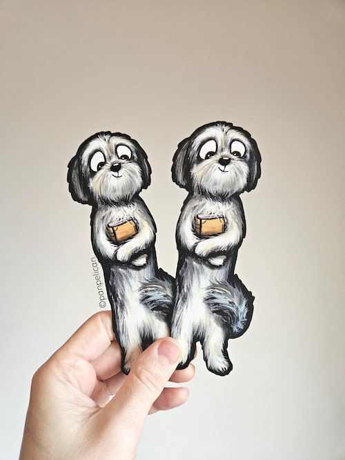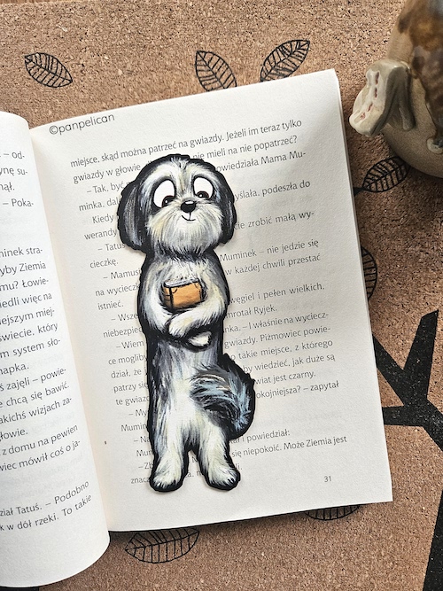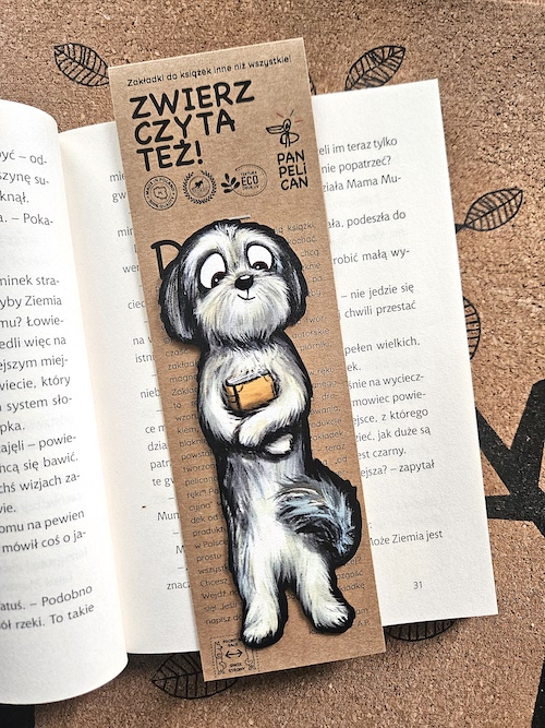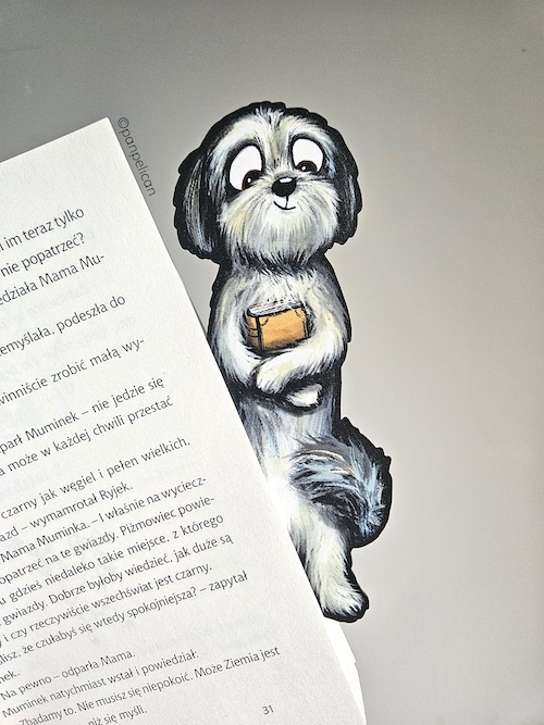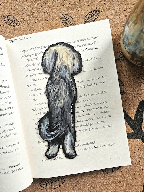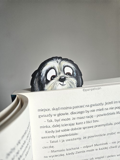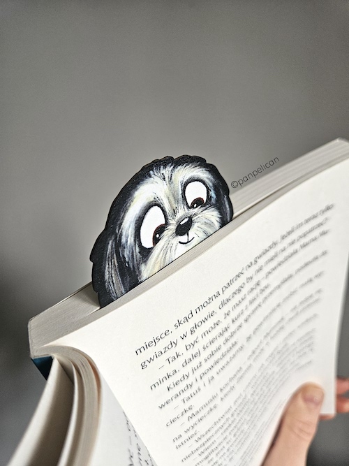 Autorska dwustronna zakładka do książki „Shih tzu Tadzio”*. Druk na ekotekturze, reprodukcja malowanego ręcznie wzoru. Wymiary: 16 cm x 1mm.