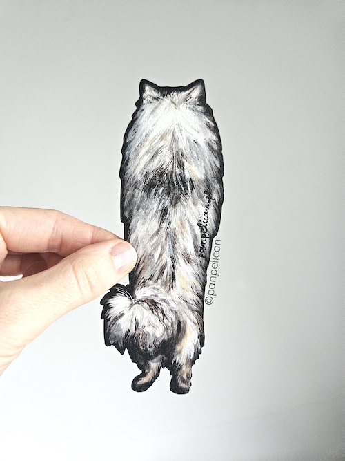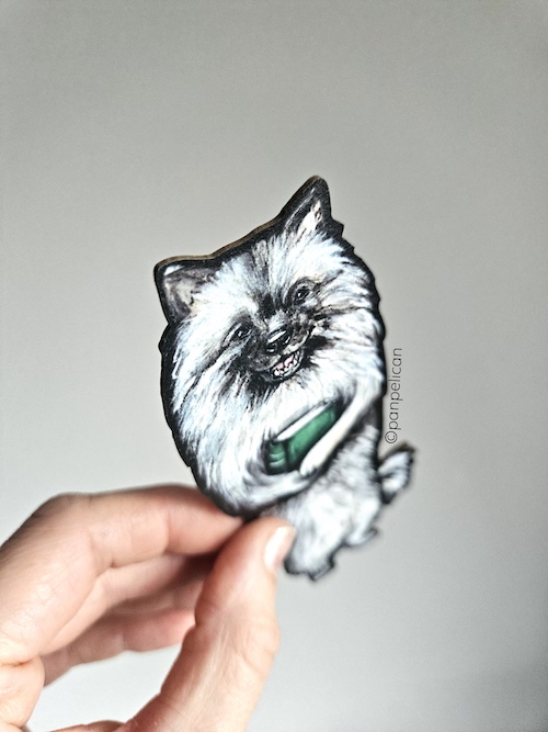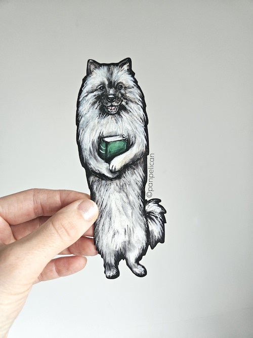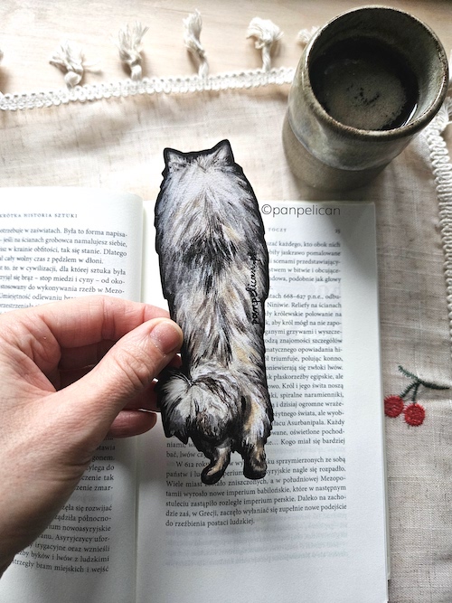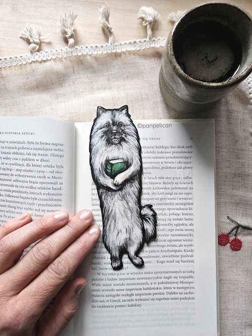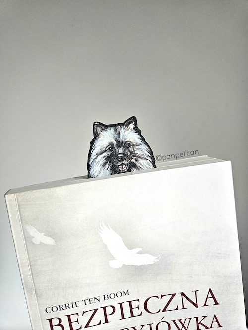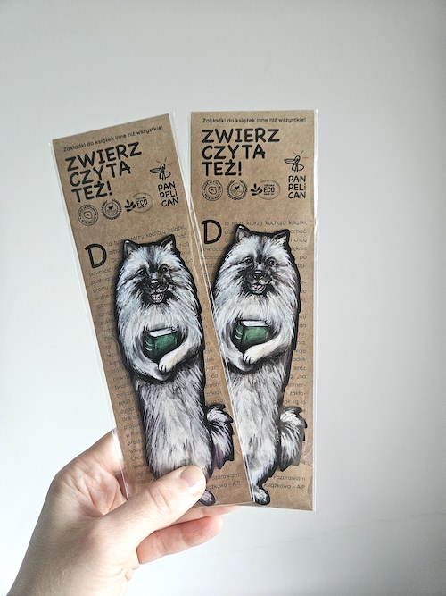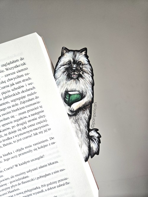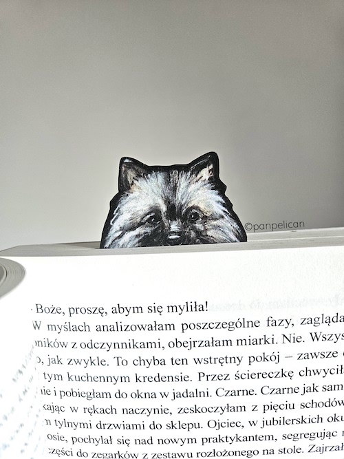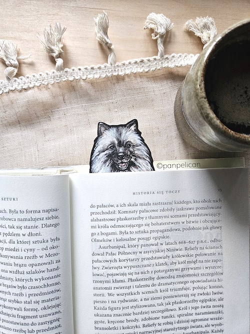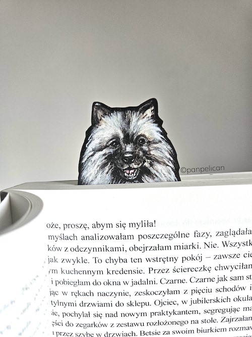 Autorska dwustronna zakładka do książki „Szpic wilczy”*. Druk na ekotekturze, reprodukcja malowanego ręcznie wzoru. Wymiary: 17 cm x 1mm.